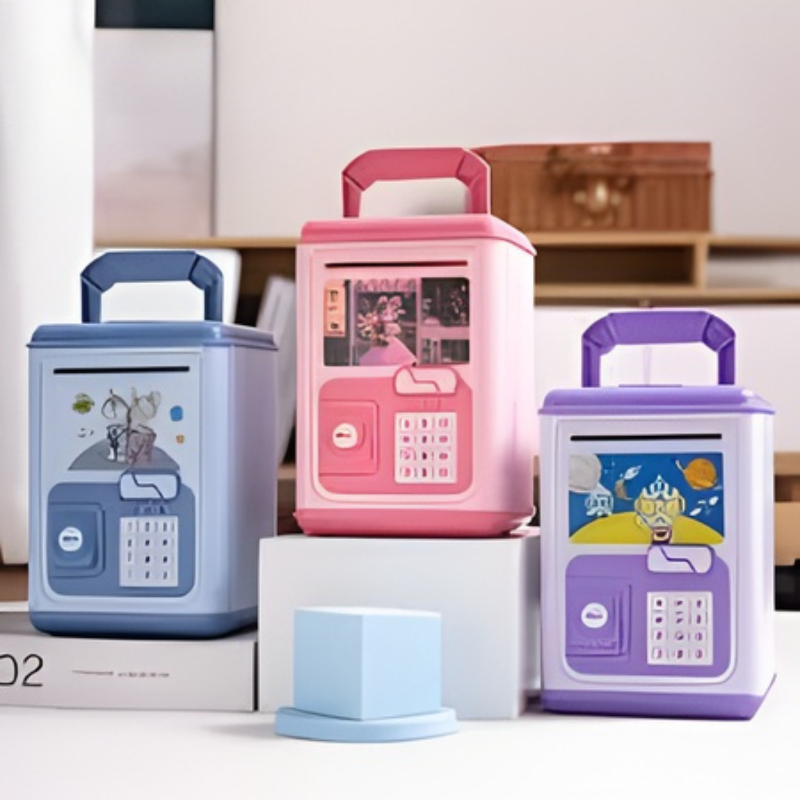 Kids Piggy Bank and Safe Box】: The kids piggy bank is password protected by 4 Digits Password Lock. Default password is 0000. By setting own password, children can easily keep her money safe. The atm piggy bank for real money can acept cash and coins. It is specially prepared for kids boys girls. The piggy bank can store 600 pieces of coins or 200 pieces of paper money. It may also be used as a password safe box to store the toys, jewelry, baseball cards, playing cards and other small items.